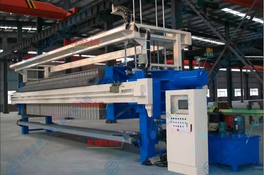 自動拉板壓濾機采用PL C控制,能對壓濾機進行各項操作(如濾板壓緊、集液板合并和開啟、松開濾板、拉開濾板),并留有遠程控制接口,能遠程自動操作控制。